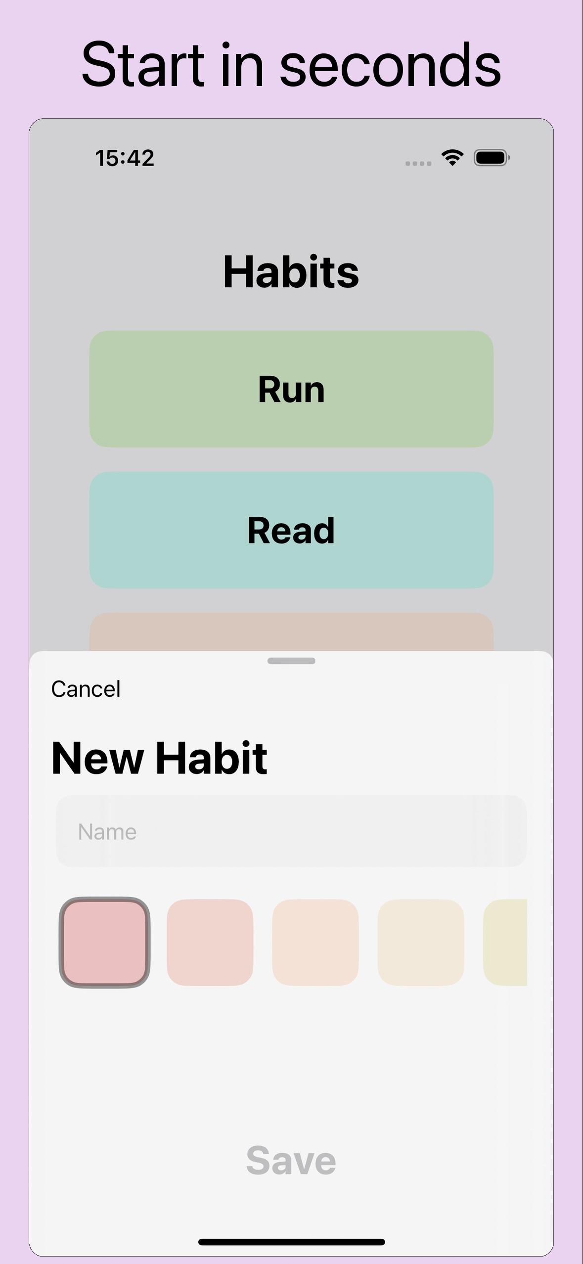 Each habit is a tile. Swipe right to complete. Swipe left for details. Nothing else.